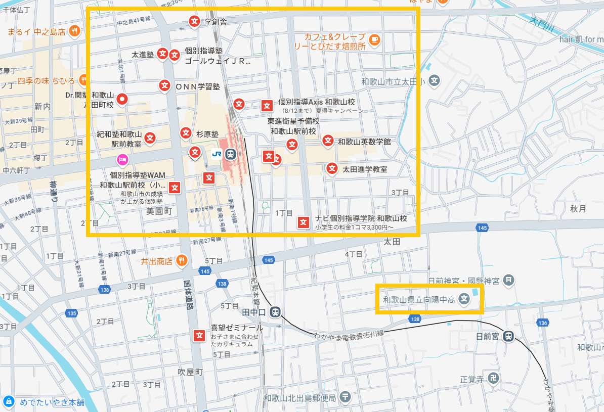 (向陽高校は和歌山駅から近く、学習塾も充実している)